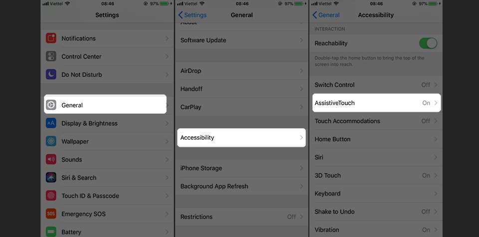 Bước 1: Từ màn hình chính, các bạn hãy truy cập vào Settings > General > Accessibility > AssistiveTouch