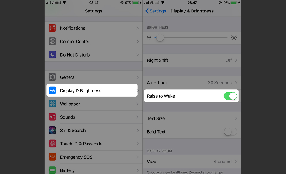 Bước 2: Kéo xuống và tìm mục “Raise to Wake”, gạt sang phải để bật tính năng này lên.