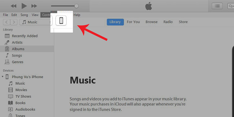 Bước 1: Kết nối iPhone với máy tính và mở iTunes lên và chọn biểu tượng điện thoại ở góc bên trái màn hình.