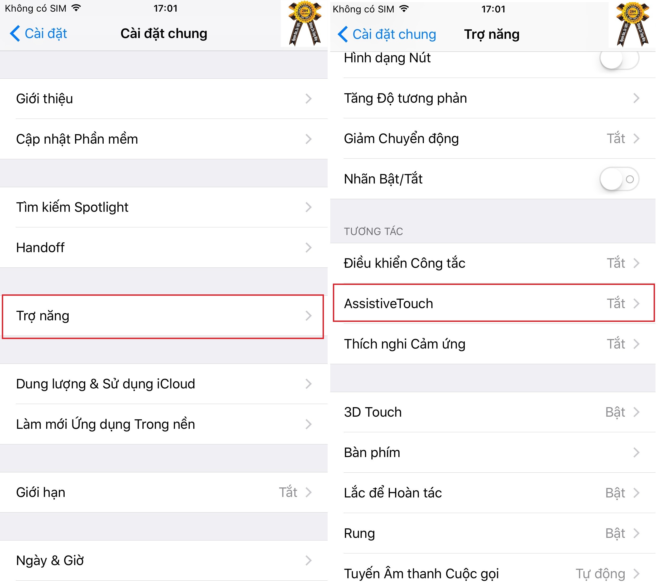 Bước 1 : Bạn vào Cài đặt chung >>> Trợ Năng >>> AssistiveTouch ( kích hoạt để bật nút Home Ảo lên ) .