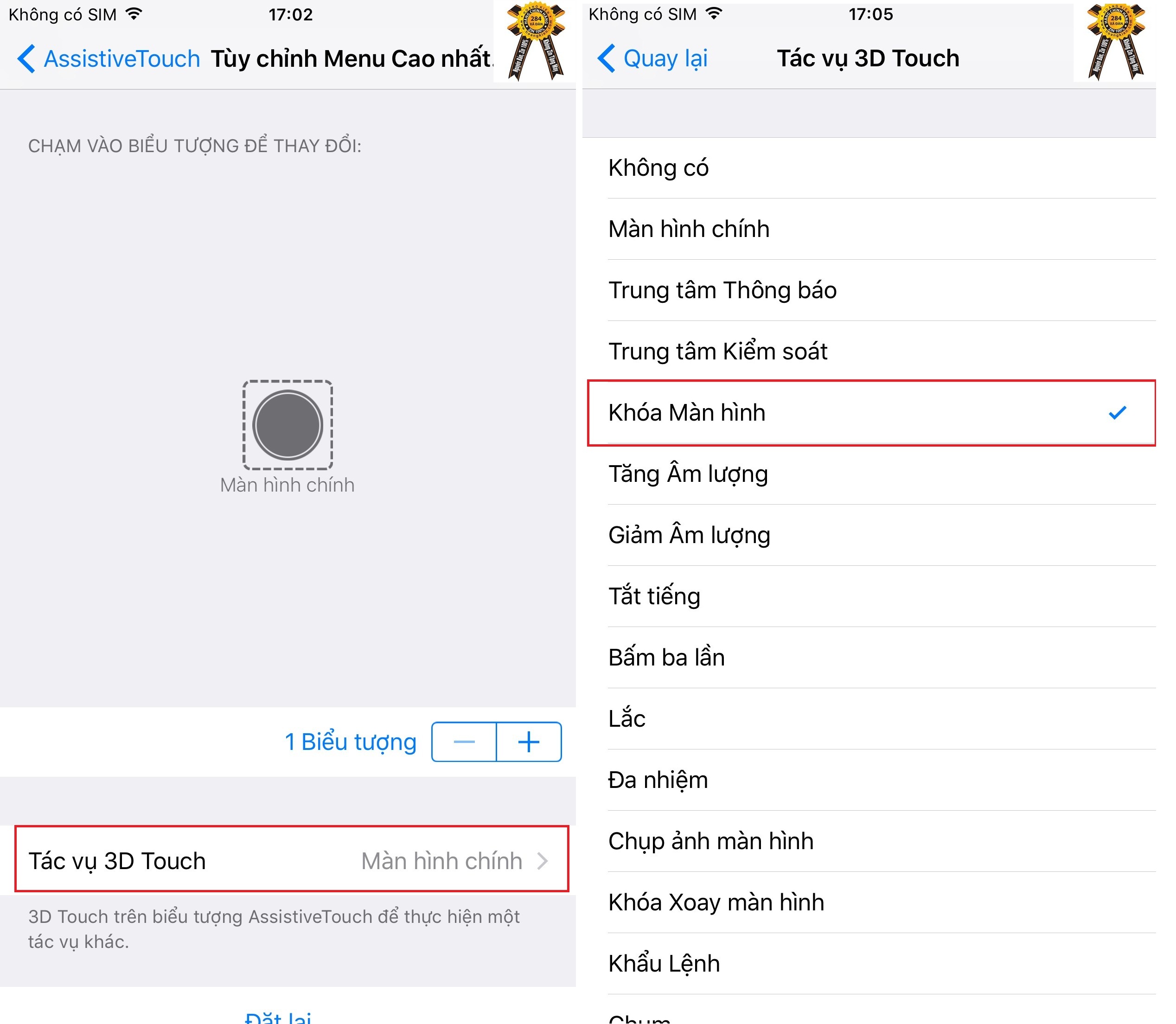 Bước 3 : Bạn Nhấn vào mục tác vụ 3D Touch >>> Khóa màn hình