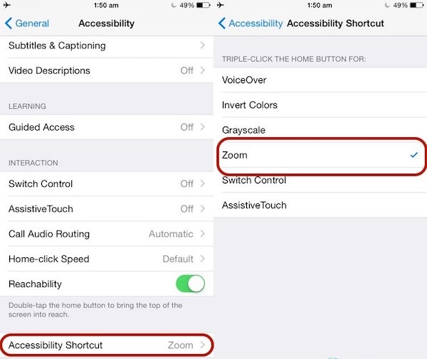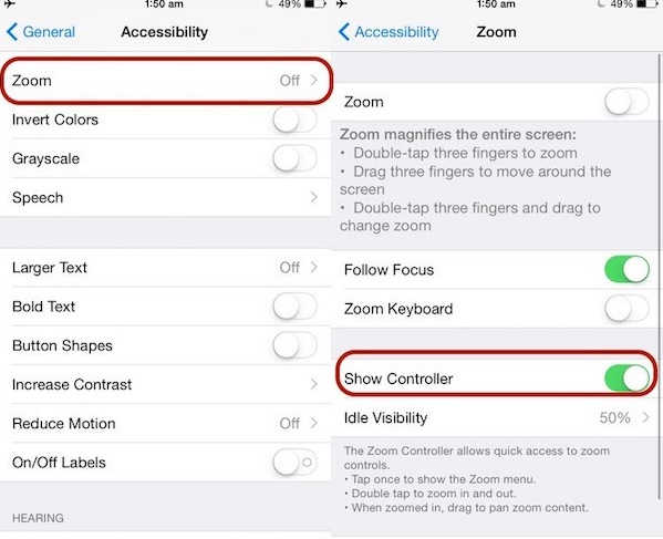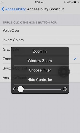 Để giảm độ sáng màn hình bạn sẽ vào Cài đặt, chọn Cài đặt chung, chọn vào Trợ năng, sau đó chọn Zoom, bạn bật tính năng Show Controller lên. Sau đó, quay lại menu trước, kéo đến Shortcut, chọn bật Zoom lên. Nhấn tiếp vào nút Home và bấm trên bộ điều khiển tròn để đưa lên. Đặt thanh trượt ở mức tối thiểu và chọn Choose Filter, chọn Low Light.