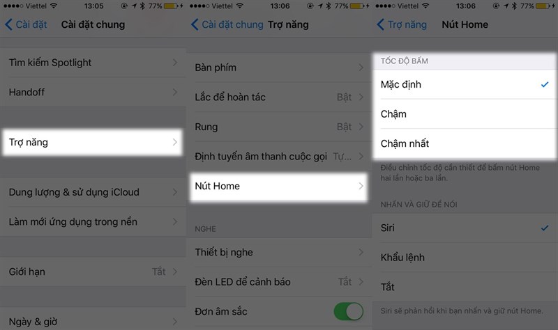 Nếu cách trên không giúp giải quyết vấn đề, bạn hãy thử kiểm tra lại tùy chọn Tốc độ bấm nút Home trên iPhone. Tại đây bạn có thể điều chỉnh tốc độ cần thiết để bấm nút Home hai hoặc ba lần. Để truy cập vào đây, chọn Cài đặt > Cài đặt chung > Trợ năng > Nút Home.