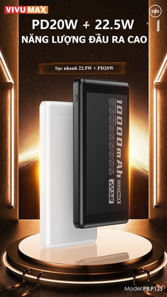 Pin sạc dự phòng Polymer 10.000mAh Vivumax P125 tích hợp công nghệ tiên tiến với cổng sạc Type C (PD) dùng chung cho đầu ra và đầu vào cực kỳ tiện lợi. Ngoài ra, Pin sạc dự phòng Polymer 10.000mAh Vivumax P125 với cổng sạc nhanh PD20W và USB 22.5W sạc siêu nhanh.
