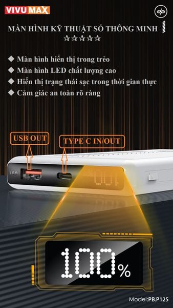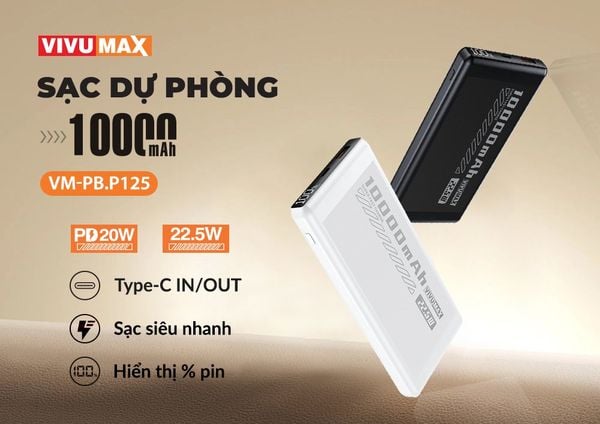 Bên cạnh đó sạc có màn hình LCD hiển thị đúng % dung lượng pin còn lại, giúp bạn dễ dàng theo dõi dung lượng pin. Ngoài ra, pin sạc dự phòng Polymer 10.000mAh Vivumax P125 hỗ trợ 2 cổng sạc vào USB 22.5W và Type C (PD) 20W sạc siêu nhanh.