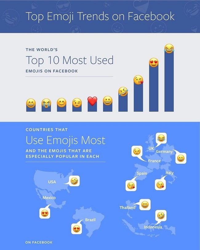 Ngày 17/7 vừa qua trên Facebook của mình, Mark Zuckerburg đã chia sẻ 10 biểu tượng được sử dụng nhiều nhất trên toàn thế giới. Và kết quả là biểu tượng mặt vừa cười vừa khóc hoặc trái tim ngọt ngào được sử dụng nhiều nhất.