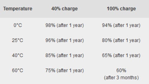 | Bảng thống kê cho thấy, pin smartphone càng sạc đầy dung lượng ở mức nhiệt độ càng cao, càng nhanh bị suy giảm hiệu năng. Ảnh: Phonearena |