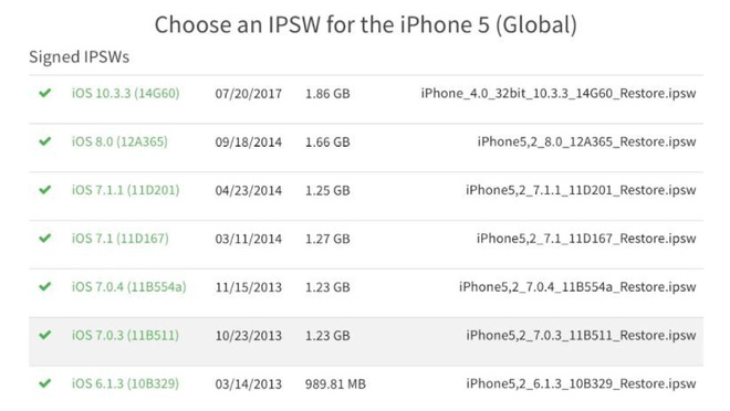 Mới đây trên trang IPSW.me, Apple đã bất ngờ mở sign cho phép các thiết bị cũ hạ xuống những phiên bản hệ điều hành iOS thấp hơn. Trong đó bao gồm dòng iPhone 5, 5S, 5C, iPad Mini 2 có thể hạ xuống iOS 6.1.3 và iPad Mini 4 hạ xuống được iOS 6.0.1.