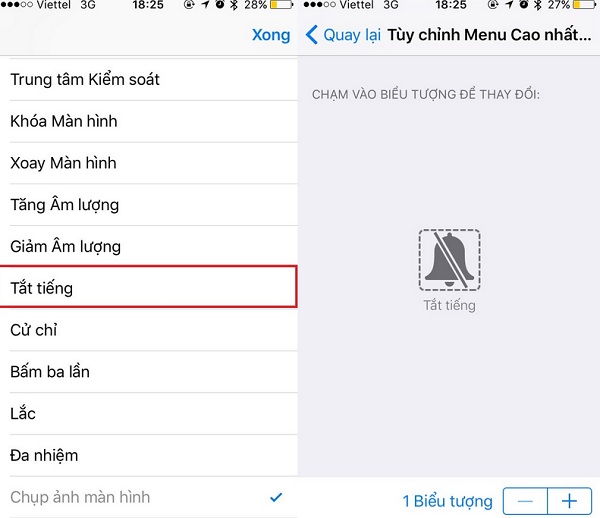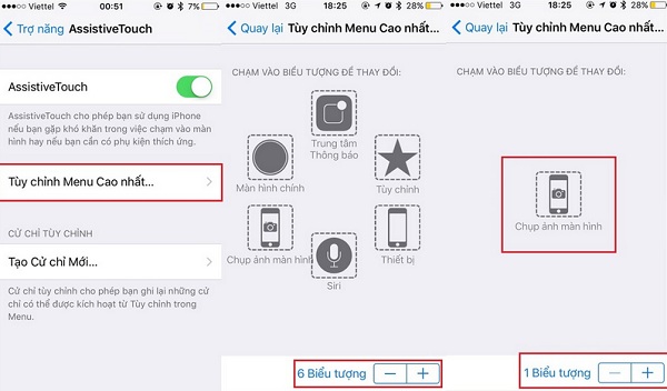 Bước 2: Sau khi bật AssistiveTouch bạn sẽ thấy dòng "Tùy chỉnh Menu cao nhất", mặc định ở đây có 6 biểu tượng, bạn hãy bấm vào dấu trừ (-) để giảm nó xuống còn 1 biểu tượng duy nhất.
