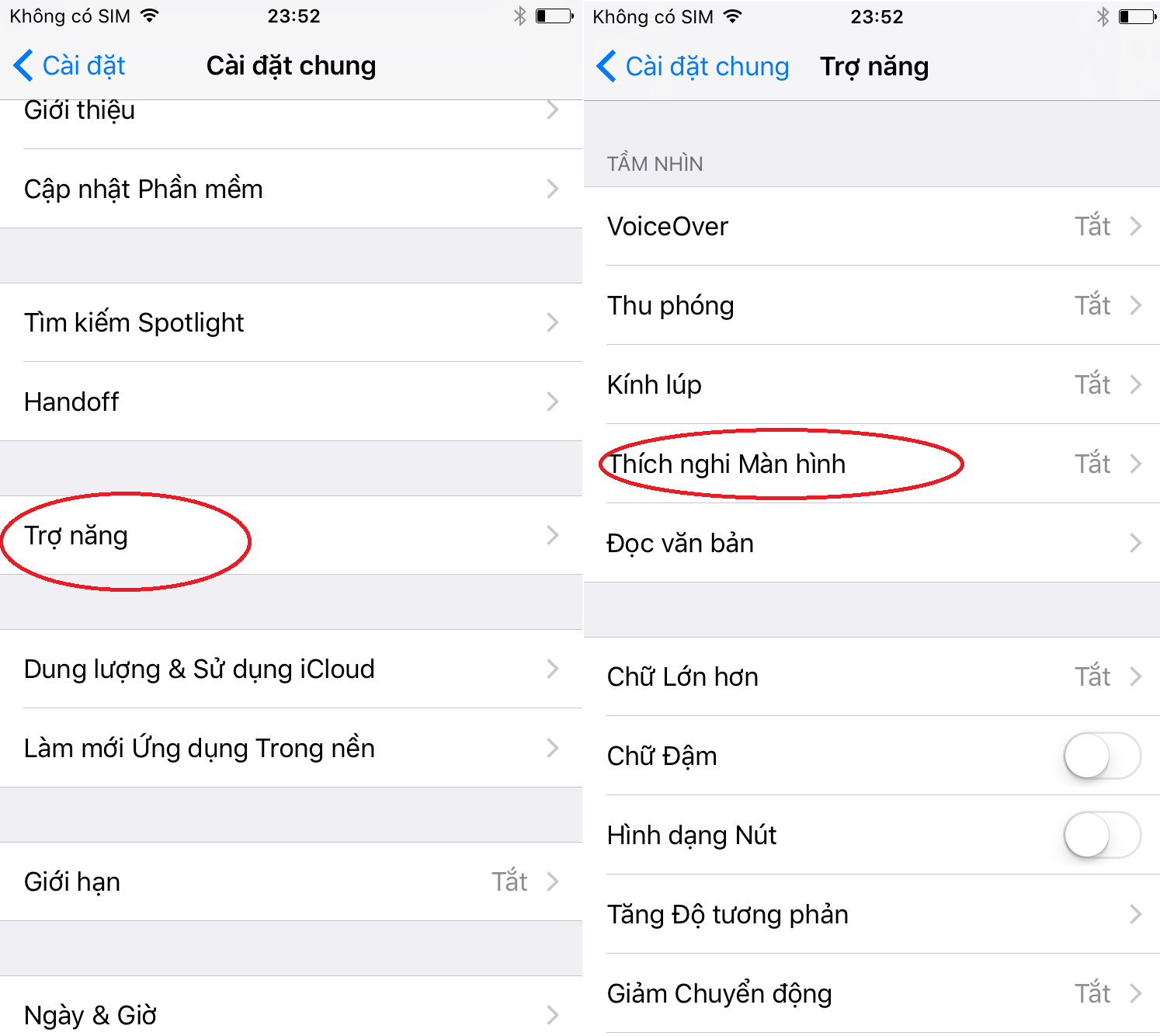 1 : Vào Cài đặt (Settings) > Cài đặt chung (General) > Trợ năng (Accessibility) > Thích nghi Màn hình (Display Accommodations).