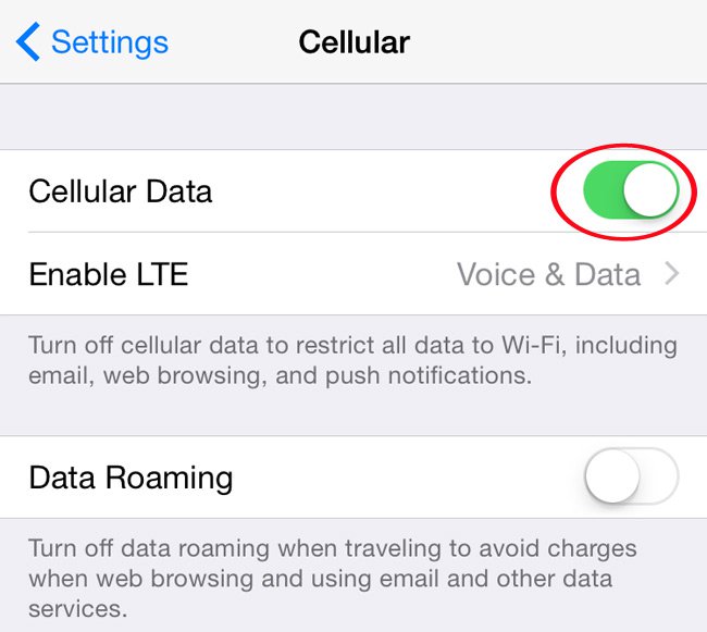 Có thể do quá trình kết nối Wi-Fi hoặc 3G trên thiết bị của bạn gặp trục trặc, dẫn đến việc không thể gửi hình ảnh đi được. Để kiểm tra, chúng ta truy cập vào Settings > Cellular. Tiếp đến tại mục Cellular Data hãy chắc chắn thanh ngang được gạt sang bên phải nghĩa là ở chế độ bật.
