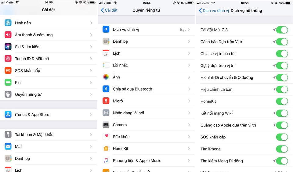 Để thay đổi lại quyền truy cập dịch vụ định vị, bạn chỉ cần vào trong Cài đặt > Quyền riêng tư > Dịch vụ định vị > Truy cập các ứng dụng và thay đổi quyền tương tác vị trí của bạn. Đối với các ứng dụng quan trọng như Bản đồ thì bạn có thể cho phép nó chạy khi sử dụng ứng dụng. Còn đối với các ứng dụng camera, xem phim... thì có lẽ bạn nên tắt hẳn nó đi. Ngoài ra, bạn có thể điều chỉnh tắt đi các dịch vụ hệ thống mà yêu cầu định vị vị trí không cần thiết ở ngay bên dưới cùng cài đặt.
