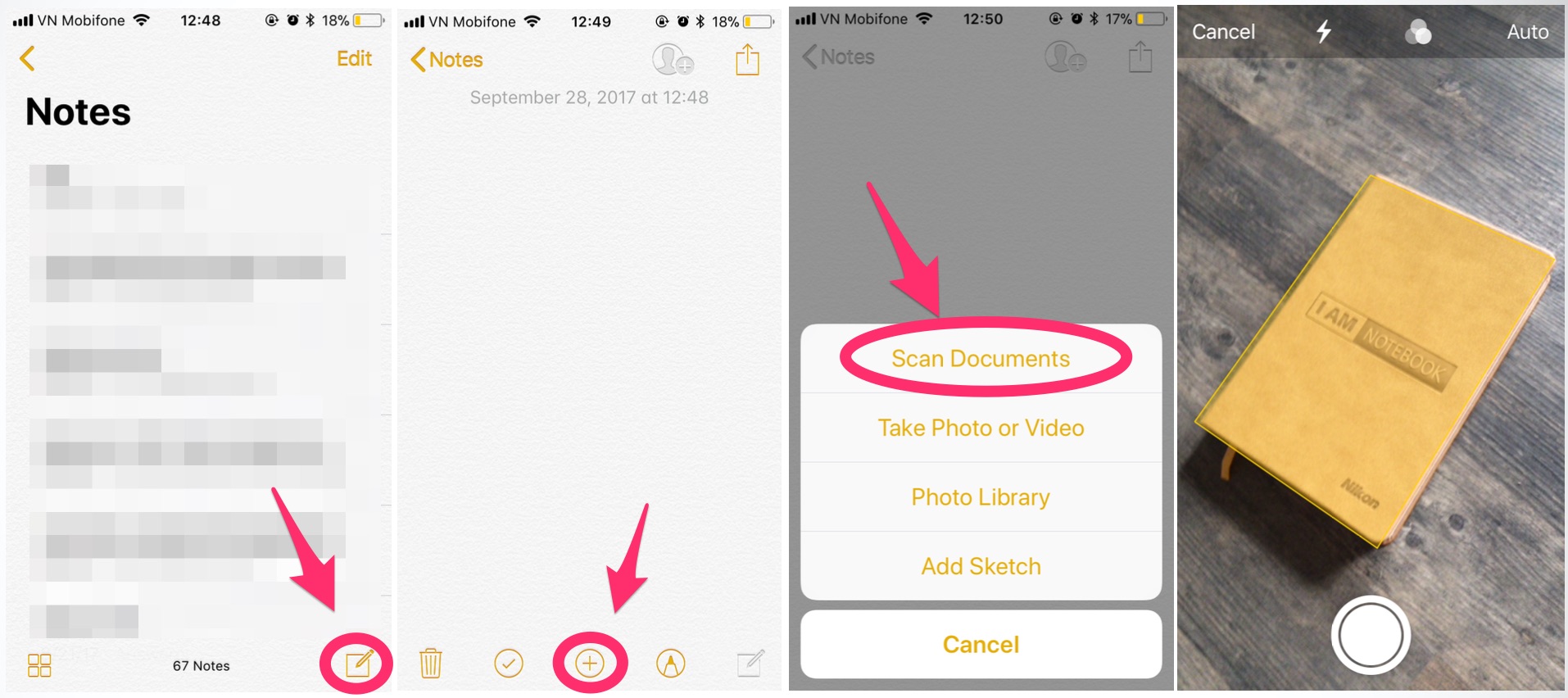 Trước đây khi muốn scan tài liệu, người dùng iPhone thường tải ứng dụng ở ngoài hoặc dùng máy ảnh để chụp lại tài liệu, sau đó chỉnh sửa màu sắc và đi in. Tuy nhiên trên iOS 11, bạn không cần phải tải ứng dụng gì cả vì Apple đã tích hợp bên trong hệ điều hành. Để bật tính năng này, hãy vào ứng dụng Notes (Ghi Chú), nhấn vào dấu + ở phần dưới màn hình, 4 tuỳ chọn sẽ hiện ra và trong đó có tuỳ chọn "Scan Documents" (Scan tài liệu), hãy nhấn vào tuỳ chọn đó.