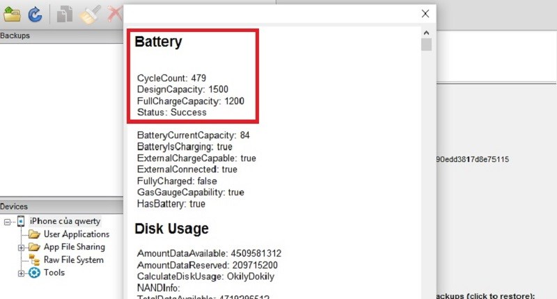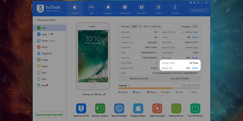 Sau khi tải về và cài đặt, mở phần mềm 3uTools lên và tiến hành kết nối iPhone với máy tính bằng cáp sạc. Ở phần Info (Thông tin) của phần mềm, ở phía bên tay phải bạn sẽ thấy thông tin về số lần bạn đã sạc đầy 100% pin và chất lượng pin còn lại.
