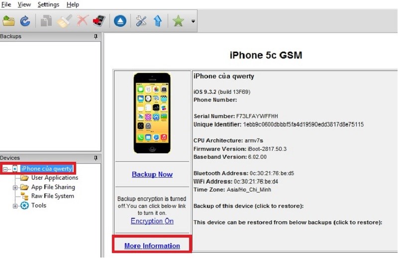 Cài đặt xong mở phần mềm iBackupbot, kết nối iPhone với máy tính bằng cáp sạc. Sau đó chọn iPhone của bạn trong mục Device rồi chọn More information.