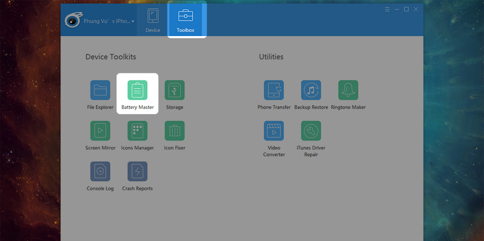 Cài đặt xong cũng mở phần mềm iTools lên, sau đó cắm cáp để kết nối iPhone với máy tính. Ở giao diện chính của phần mềm bạn chọn thẻ Toolbox rồi chọn thẻ Battery Master ở phía dưới.